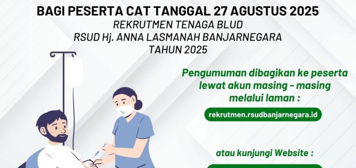 [smartslider3 slider=”4″] Sehubungan dengan tahapan seleksi Rekrutmen Tenaga BLUD di lingkungan RSUD Hj. Anna Lasmanah Banjarnegara Tahun 2025, bagi peserta yang sudah mengikuti tahapan Tes CAT tanggal 26 Agustus 2025, tahapan selanjutnya yaitu...
