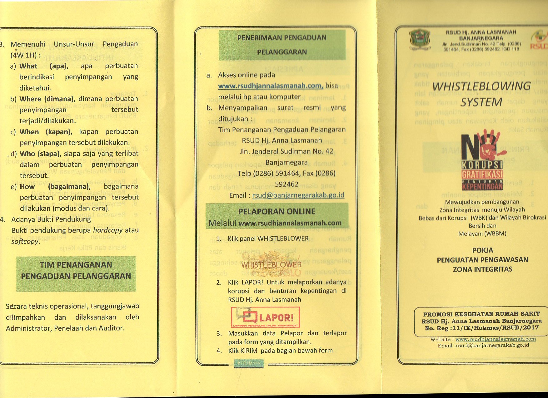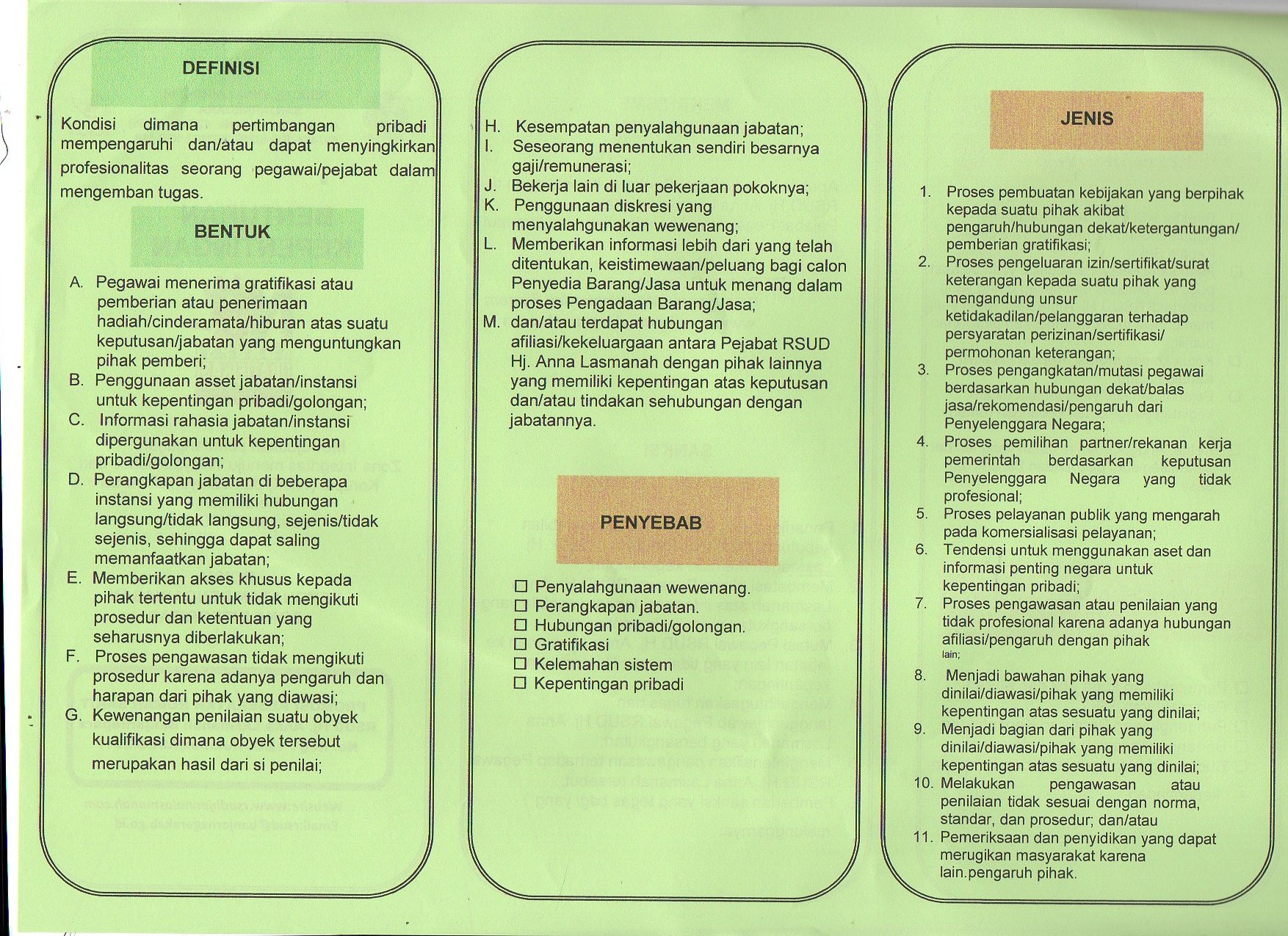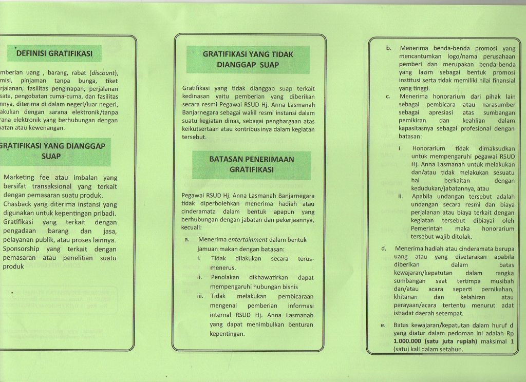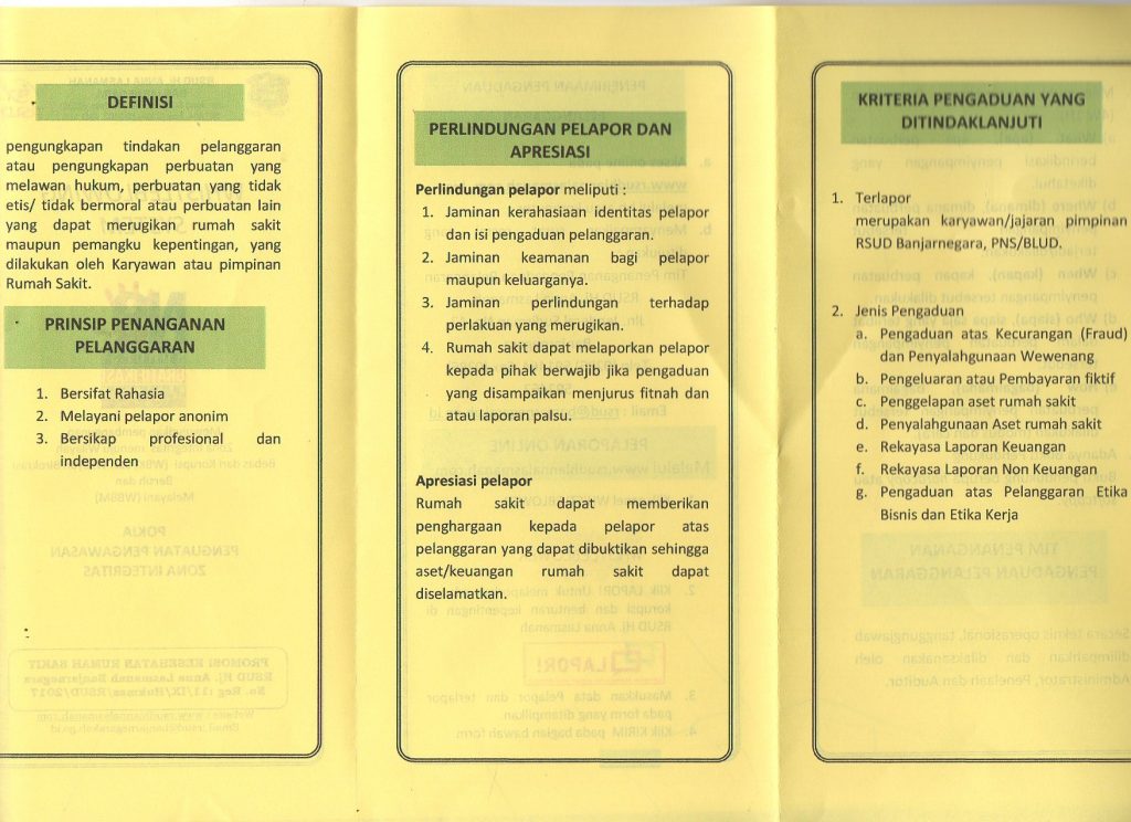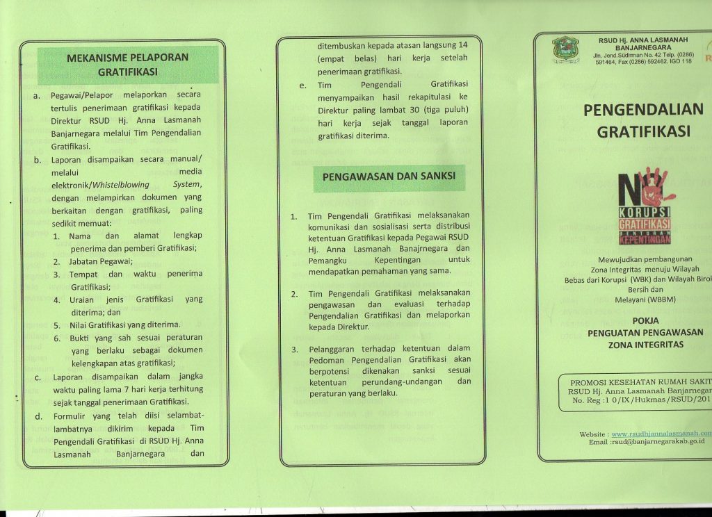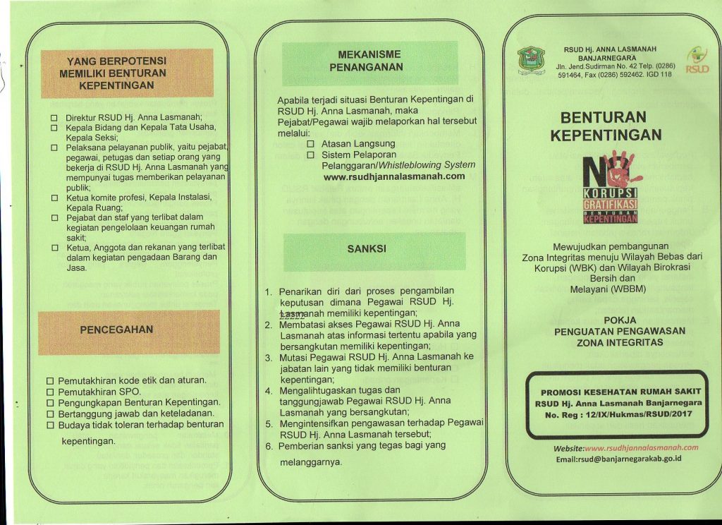 Leaflet Benturan Kepentingan, Wisthle Blowing System, Pengendalian Gratifikasi, Sistem Pengendalian Intern Pemerintah, RSUD Hj. Anna Lasmanah Banjarnegara oleh rsud banjarnegara · Dipublikasikan 13 Juni 2020 · Di update 4 Juli 2021
