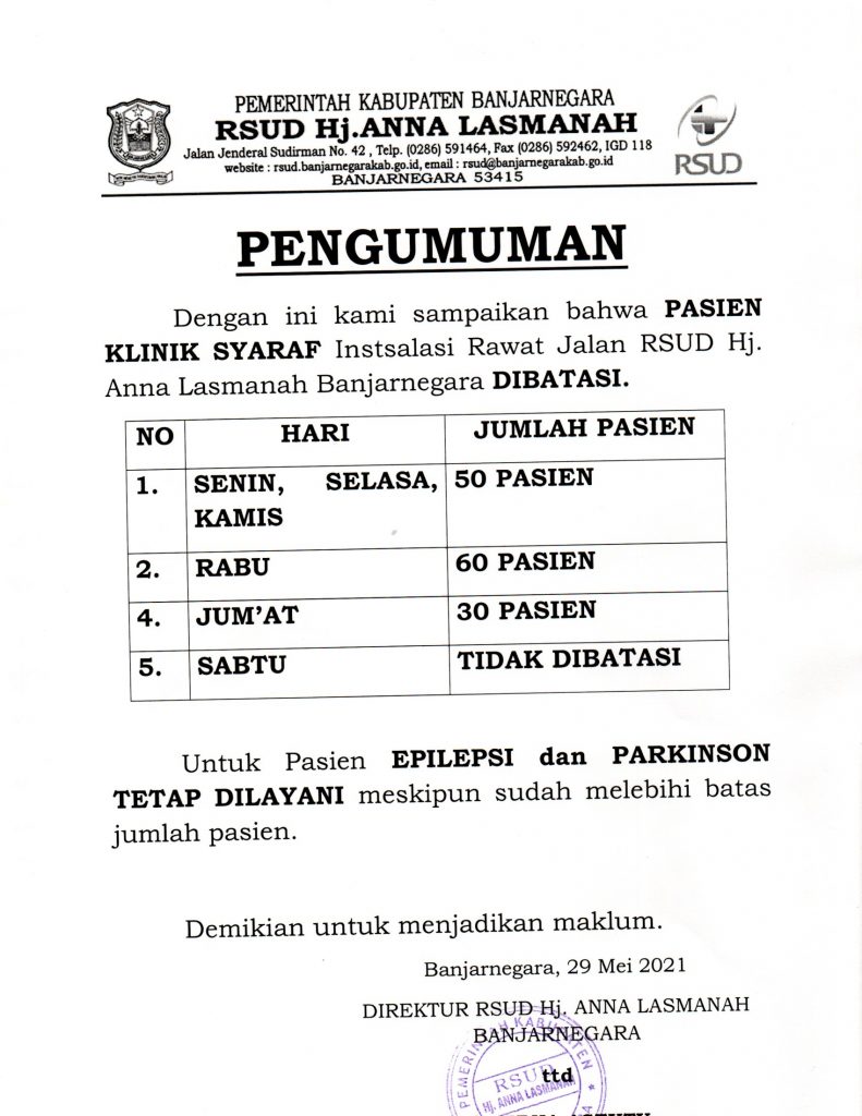 MULAI SENIN, 31 MEI 2021 JUMLAH PASIEN KLINIK SYARAF INSTALASI RSUD Hj. ANNA LASMANAH BANJARNEGARA DIBATASI