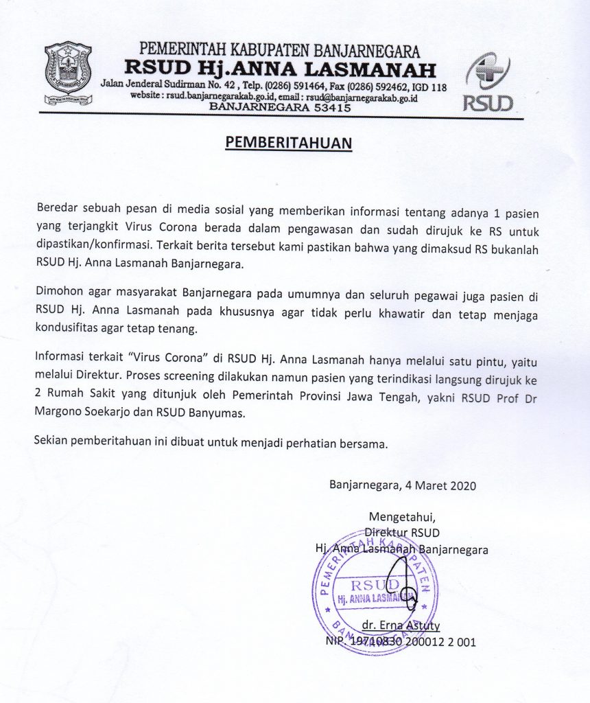 PEMBERITAHUAN TENTANG VIRUS CORONA oleh rsud banjarnegara · Dipublikasikan 4 Maret 2020 · Di update 4 Juli 2021 MOHON PERHATIAN BAGI MASYARAKAT BANJARNEGARA DAN SEKITARNYA