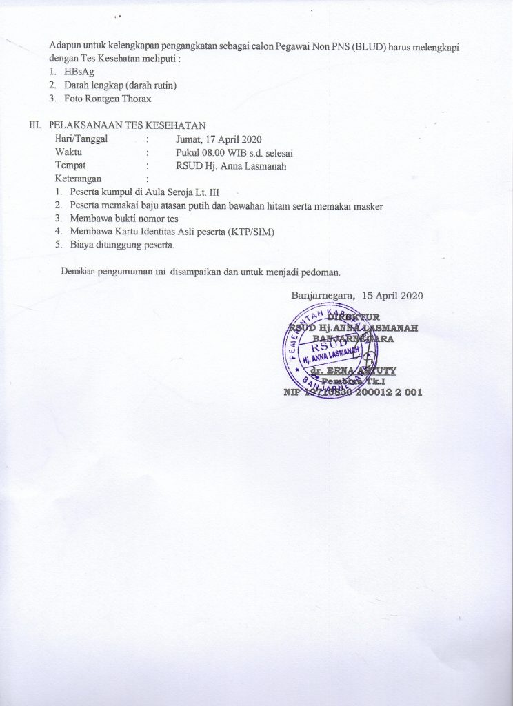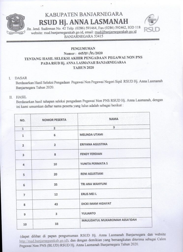 PENGUMUMAN SELEKSI AKHIR PENGADAAN PEGAWAI NON PNS oleh rsud banjarnegara · Dipublikasikan 16 April 2020 · Di update 4 Juli 2021 BERIKUT INI KAMI SAMPAIKAN HASIL SELEKSI AKHIR PENGADAAN PEGAWAI NON PNS RSUD Hj. ANNA LASMANAH BANJARNEGARA 2020