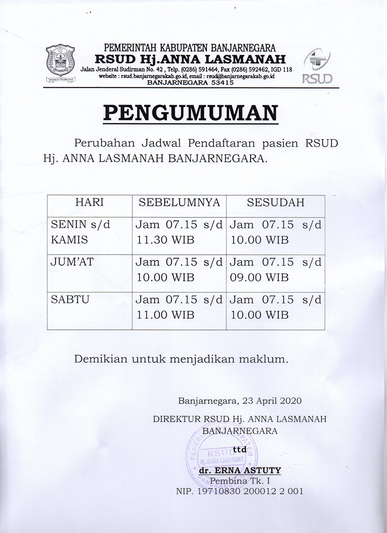 PERUBAHAN JADWAL PENDAFTARAN PASIEN DI RSUD Hj. ANNA LASMANAH BANJARNEGARA oleh rsud banjarnegara · Dipublikasikan 27 April 2020 · Di update 4 Juli 2021